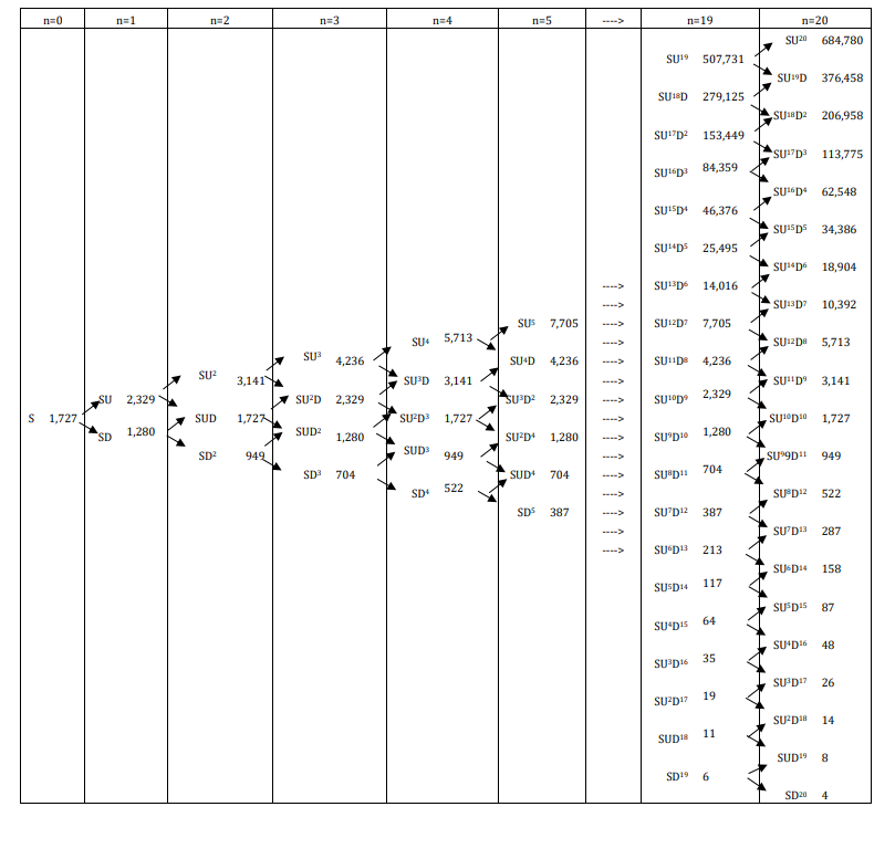 This Binomial tree model assumes that the maturity date of an option can be divided in discrete periods, whose dimension will be represented by δt. Additionally, the price of the underlying asset is subject to a given behavior, and it will be multiplied by a random coefficient U or D, at each period (δt). It may be noted that random coefficients are defined as the price variation rate of the underlying asset. Since this rate can be ascending (U) or descending (D), reflecting the favorable or unfavorable market conditions, these multiplicative factors are dependent on volatility (σ) and length of the periods (δt). Figure 1 presents a binomial tree for the underlying asset, illustrating its price evolution. The nodes at the right represent the distribution of possible future values for the underlying asset.