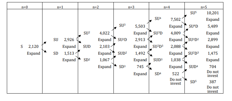 Since the expansion investment of, $10,201 million, is greater than the underlying asset value of $ 7,705 million at SU5 node, the expansion option has to be exercised to invest. But the expansion option cannot be exercised at SD5 node because the value of expansion investment is lower than the value of underlying asset.