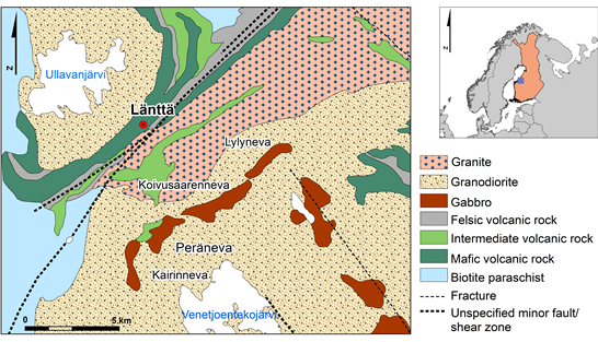 The pegmatite deposit of Länttä, Western Finland, is located at Ullava, about 60 km southeast of Kokkola town. The Länttä pegmatite occurs in the Kaustinen lithium province that covers roughly 500 km2 in the Paleoproterozoic Pohjanmaa Schist Belt (1.92 Ga), which forms a 350 km long and 70 km wide arc-shaped belt between the Central Finland Granite Complex in the East and the Vaasa Migmatite Complex in the West (Figure 1). The pegmatites are younger than the 1.89-1.88 Ga peak of regional metamorphism, have an age of 1.79 Ga (U-Pb columbite age) and crosscut Svecofennian 1.95–1.88 Ga supracrustal rocks, which are composed of schists with some intercalations of sulphide-bearing black schists and volcanic metasediments. The metamorphic grade in the Pohjanmaa Schist Belt varies from low amphibolite facies in the eastern part to high amphibolite facies towards the Vaasa Granite complex [23]. At least, 16 separate albite-spodumene-pegmatite occurrences are known in the Kaustinen lithium province [24].