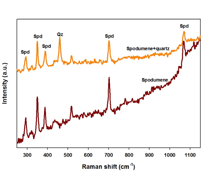 Mineralogical studies, using optical microscopy and SEM observations, XRD and Raman analyses, showed that, in the case of Länttä, spodumene occurs with fine quartz intergrowths and is crosscut by fine albite and K-feldspar to some extent, whilst microinclusions of quartz and albite were found in the Gonçalo lepidolite.