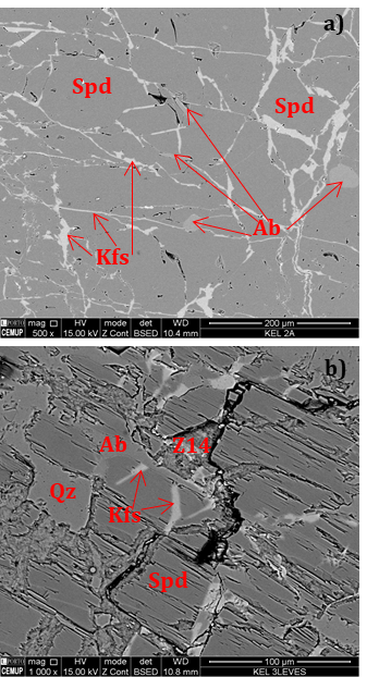 SEM analyses were also carried out. As expected, the backscattered images (BSE) show spodumene with fine quartz intergrowths, albite replacing spodumene and K-feldspar in thin veinlets (Figures 10 and 11).
