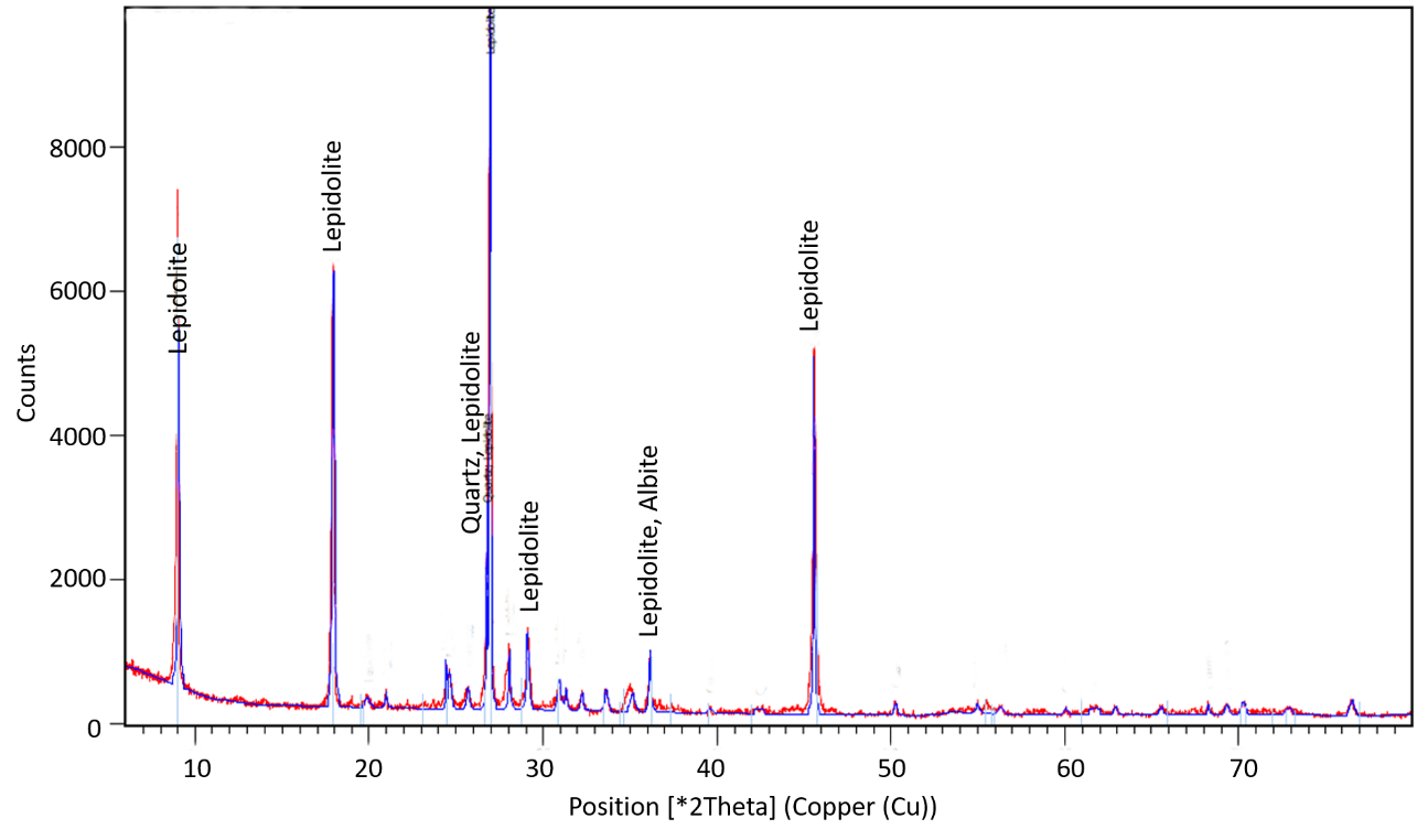 Applying the Rietveld Refinement, it was possible to quantify the main minerals present in the concentrate: 19.1 % albite, 23.9 % quartz and 57.1 % lepidolite. Once again, the refinement method did not reach a good agreement of statistical criteria due to the overlapping of albite and lepidolite as well as inclusions of quartz or albite in lepidolite that produce a broadening of the peak base for the most intense reflections. This broadening of the peak base is an indicator of the presence of locked particles, even at those fine sizes.