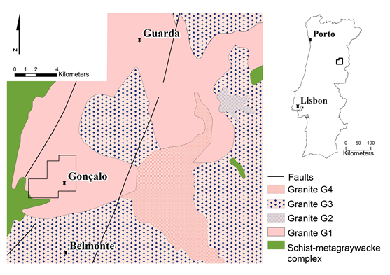 The Gonçalo pegmatite district is located in Central Portugal, approximately 20 km south of Guarda town, not far from the eastern border of Spain, and covers an area of 100 km2 of the Central Iberian Zone in the western extreme of the European Variscan Belt. The pegmatites are granitic in composition occurring as veins cutting a synorogenic Variscan coarse-grained porphyritic biotite>muscovite granite (Guarda granite) with 304.1±3.9 Ma [29] (Figure 2).