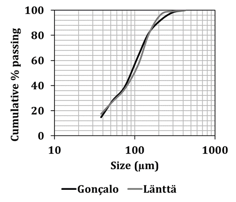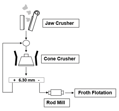 In this study samples of pegmatites from the Länttä spodumene deposit (Finland) and from the Gonçalo lepidolite deposit (Portugal) were studied. The same comminution diagram was applied to all samples to produce material with suitable size for froth flotation (Figure 3). Samples were primarily crushed in a jaw crusher (single toggle 5’’x 6’’, 4 kW, 325-375 rpm, Denver) and in a cone crusher, followed by a rod mill. Figure 4 shows the particle size distribution (PSD) of both samples after the comminution. All material is below 425 µm. It can be seen that almost 30 % of the sample mass is below 53 µm, which must be removed before flotation, since the presence of fine particles reduces flotation efficiency. Table 1 shows the main size parameters and Li2O grades of the studied samples.