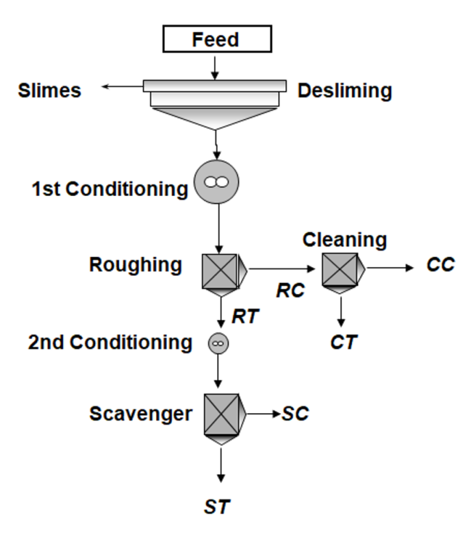 As mentioned before, froth flotation has become the most important and efficient method for lithium mineral processing [21], consequently it was the method applied to concentrate both lithium-rich pegmatites. Figure 5 presents the flotation flow sheet developed: a previous “desliming stage” is crucial for slimes removal, followed by three flotation stages, starting with a rougher stage. The rougher concentrate (RC) was upgraded in a cleaning stage, that produced a final clean concentrate (CC) and a middling product with high-lithium content (CT). A scavenger stage was applied to the rougher tailings (RT) to produce the final tailings (ST) and a low-lithium minerals middling product with low-lithium content (SC). Different flotation tests were carried out using distinct chemical reagents. Experimental work was conducted following reagent strategies mentioned by different authors [18, 33, 34, 35]. In the case of Länttä ore (spodumene pegmatite) tests were performed at room temperature, using two different collectors (Test A – Oleic acid; Test B – Fatty acid Aero 704 from Solvay®). An optimal pH=8.8 was maintained using NaOH. The collector was then added in two stages, at dosages of 750 g/t to the rougher and 370 g/t to the scavenger, both emulsified with fuel oil (3 kg/t). The conditioning time was 5 minutes for each stage. In the case of Gonçalo lepidolite, pH was maintained at 3 as widely referred in the literature and the collector Flotigam EDA (from Clariant®) was added at a dosage of 200 g/t in the first conditioning stage and 100 g/t in the second one, both conditioned for 3 minutes. Froth flotation tests were conducted in a Leeds open-top laboratory flotation machine with a 3.0 L cell, at an impeller speed of 1000 rpm and an air flow rate of 7.5 L/min. These reported tests were chosen among others, carried out to assess the feasibility of froth flotation to produce Li2O concentrates.