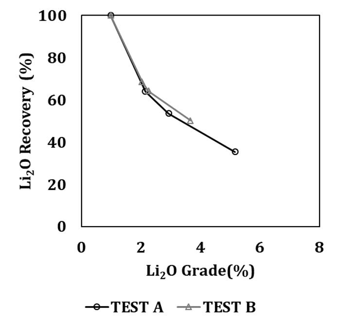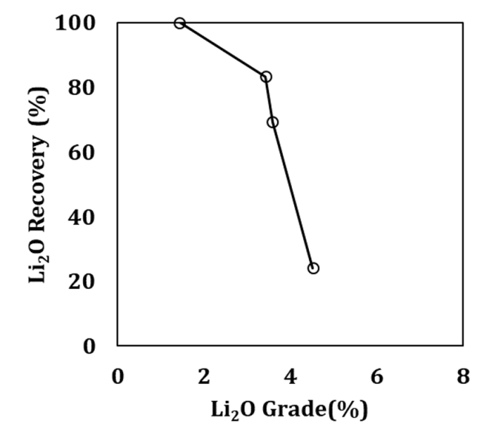 Concerning the Gonçalo lepidolite, the results of the froth flotation tests are reported in Table 3 and Figure 7 shows the correspondent grade-recovery curve.