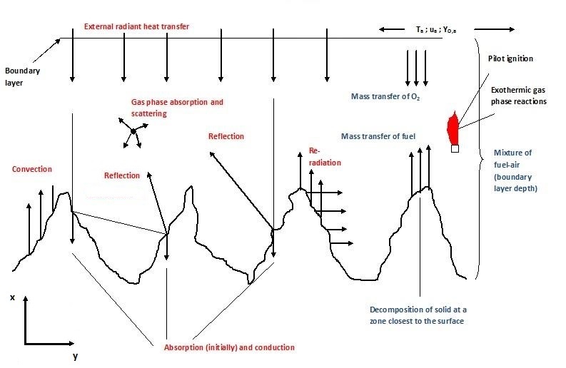 Figure 2 depicts the ignition process at a rough surface where the fuel sample has a horizontal orientation and the mass flow in the direction of the heat source. In the case of a vertical fuel sample orientation the physics will different, also a forced flow will present a different situation as opposed to the buoyantly generated flow seen in Figure 2.