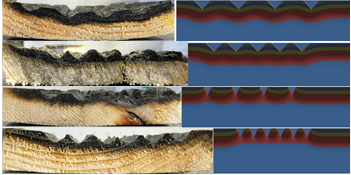 The three parameters above represent the three groups that surface roughness structures are normally divided into: amplitude parameters, horizontal distance parameters and parameters representing a combination of amplitude and horizontal distance parameters. In the ensuing two-dimensional analysis and cone calorimeter experiments gauges with certain angles, depths and distances were applied in order to depict roughness features. In Figure 1 the parameters are described for a two-dimensional cross-section of a specimen. The simplified surface roughness features and the milling of the structures were performed to obtain controlled and homogeneous structures suitable for an exploratory analysis.