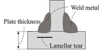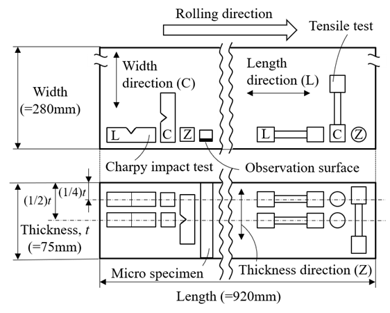 All steel samples were provided for tensile test and Charpy impact tests. Sampling locations and directions are shown in Figure 1. Two samples for tensile tests and 75 for Charpy impact tests were machined for each location and direction. Directions are defined as "L", "C" and "Z", which denote length, width, and thickness directions, respectively, as shown in Figure 1. Sampling locations were (1/2)t and (1/4)t, where t is the plate thickness. In this study, the thickness direction was particularly considered to evaluate the influence of Sn on lamellar tear susceptibility, one of the flaws of welding, which may occur in heavy sections of plate welds, as shown in Figure 2. In this case, the rolling direction is along the length direction. The specimen details for tensile tests are as follows: 32 mm gauge length and 6 mm diameter with 70 mm specimen length. UH-F500kN-A, Shimadzu Corporation was used for the tensile tests. A 2 mm depth V-notched Charpy impact test was performed under five temperatures, the common temperature of 20 ℃ and four other temperatures chosen from the range of 0 to 80℃ with 3 repetitions for each temperatur e CI-600D, Maekawa Testing Machine MFG. Co., LTD. was used for the Charpy impact tests. Crystallinities (proportion of the brittle fracture surface) were measured to determine the fracture appearance ductile to brittle transformation temperatures (FATTs) along with the absorbed energy of each Charpy impact specimen.