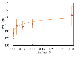 (3)According to the above and micro-Vickers hardness test results, it is assumed that the major strengthening mechanism by Sn in this study is solid-solution strengthening by Sn itself or precipitation strengthening by intermetallic compounds of Sn.