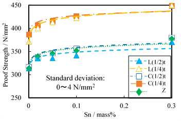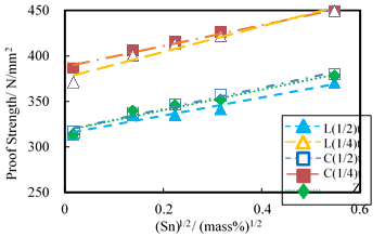 (1) Proof and tensile strength are increased with increasing Sn concentration in all directions, including the plate longitudinal, width, and thickness directions. These strengths have parabolic relationships with Sn concentration.