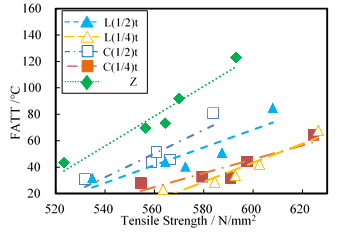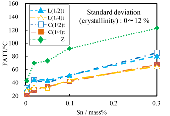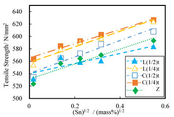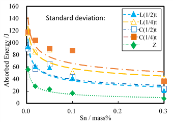 (2)Toughness, represented by FATT and Charpy absorbed energy values, was deteriorated by an increase in Sn concentration. It is positively correlated with strength. Thus, we assumed that toughness also has a parabolic relationship with Sn concentration. In addition, the toughness in the thickness direction is particularly inferior to those in other directions (plate longitudinal and width directions).