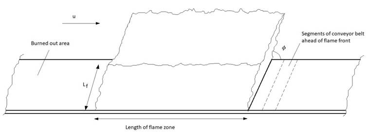 The flame volume along the conveyor belt is assumed to have the shape of a parallelepiped, see figure 2 for a sketch of the flame volume spreading along the conveyor belt in the direction of the longitudinal ventilation flow.