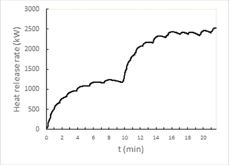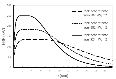 Using the measured heat release rate of 502 kW·m-2 (the peak heat release rate at an incident heat flux of 30 kW·m-2) from Alvares et al. [8], results in a heat release rate of 135.5 kW for the 0.27 m2 case. The heat release rate of 135.5 kW can be compared with the ignition source during the experiments by Rowland and Smith [7], where an output ranging from 176 to 456 kW was applied.