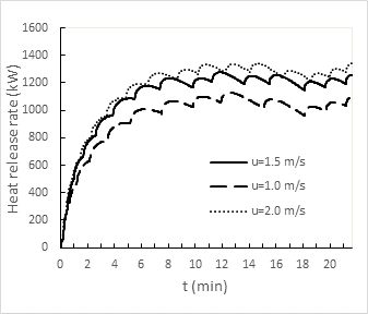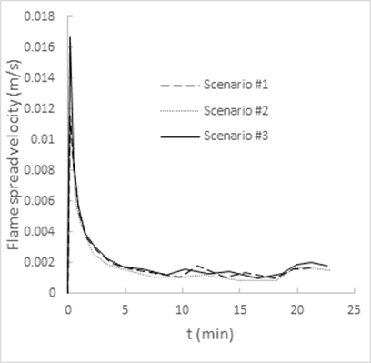 The flame spread velocity of the three scenarios is found in figure 5. Initially the flame spread velocity of scenario #3 (u=2.0 m·s-1) is higher than the other two scenarios due to a higher degree of flame tilting. As the heat release rate of scenario #3 increases, the flame tilting decreases and the flame spread velocity as well. The flame spread velocity of scenario #3 occasionally displays slightly higher values compared with scenario #1 (u=1.5 m·s-1), which is explained by the fluctuations of the heat release rate. The flame spread velocity of scenario #2 (u=1.0 m·s-1) is somewhat lower than the other two scenarios, which is explained by the lower degree of flame tilting. As can be seen from figure 5, the flame spread velocity eventually becomes steady state, which is typical of a line fire with an upper limit on the fire width.