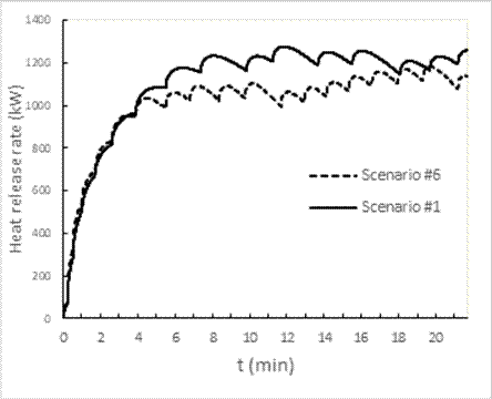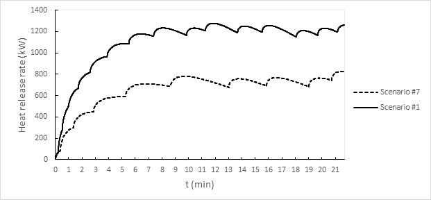 When studying the heat release rates of the two scenarios (see figure 8), it can be seen the heat release rate of scenario #5 is clearly lower than scenario #1. The higher flame spread velocities of scenario #5 will lead to faster ignition of belt segments, but with smaller width, the ignited segments will be smaller and lead to lower heat release rate. This is typical behaviour of a line fire with smaller fire width, i.e. attaining the maximum heat release rate at an early stage but resulting in a lower heat release rate.