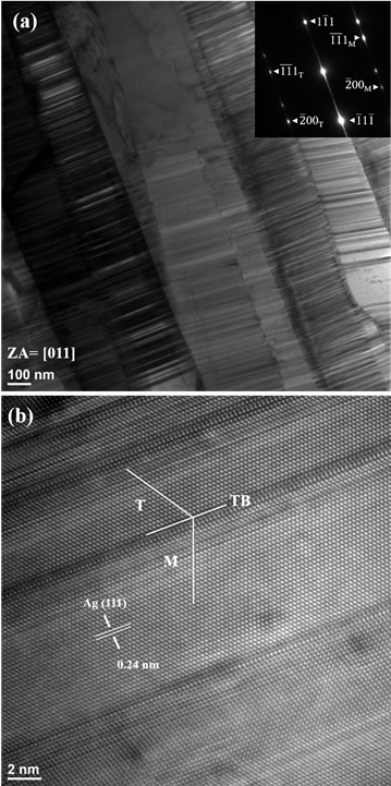 ). This revealed that the film was an fcc structure with twin structure. The high-resolution TEM image shows an atomic interplanar spacing of 0.24 nm, indicating that the nano-twinned Ag film was stacked by (111) plane. The twin thicknesses were ranged from 5 to 50 nm, with an average value of about 16 nm.
