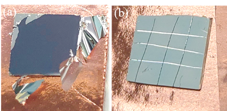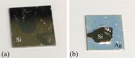 The adhesion of nano-twinned (111) Ag film on the (111) Si substrate with and without a Ti adhesive layer was evaluated using a grid peeling test. Figure 7 (a) shows that, with no Ti adhesive layer, the sputtered Ag film with a thickness of only 2 μm peeled off the (111) Si substrate. With a 0.1 μm Ti adhesive layer inserted between the nano-twinned (111) Ag film and the (111) Si substrate, the Ag film with a thickness of 9 μm exhibited no failure after the peel test, as evidenced in Fig. 7 (b). The results confirm that the addition of a Ti adhesive layer can effectively strengthen the Ag–Si interface and improve the deposition quality of nano-twinned (111) Ag film on (111) Si substrate. In addition, the adhesion strengths were measured by using a thin film pull tester. Figure 8 (a) demonstrates that the nano-twinned Ag film sputtered on Si substrate without the pre-coated Ti was directly separated from the Si substrate, indicating a very poor adhesion strength. In contrast, Ag film sputtered on Ti pre-coated Si substrate possessed an adhesion strength of 17.3 kg/cm2. As shown in Figure 8 (b), it fractured through the Si substrate, and part of Si substrate was pulled up by the stud. This result revealed that the nanotwinned Ag film was more reliable, and can be utilized in engineering applications.