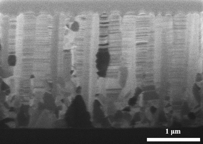 Figure 1 shows the microstructure of the cross-section of a Si/Ag specimen prepared by focused ion beam (FIB). It can be seen that many Ag columnar grains grew normal to the (111)-oriented Si substrate. These Ag grains consisted of a high density of nano-twins piled up on each other. The XRD spectrum of the sputtered Ag film on (111) Si substrate showed a strong Ag (111) peak with very weak Ag (200) and Ag (311) peaks. However, it was found that the sputtered Ag film on (111) Si peeled off easily when the thickness of the Ag film was greater than 2 μm. This result indicated that the adhesion between the nano-twinned film and the (111) Si substrate was insufficient.
