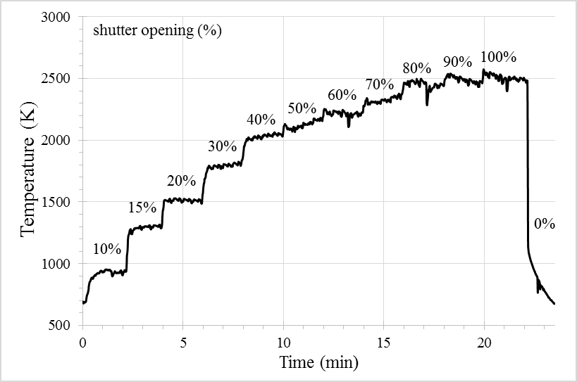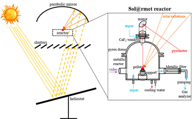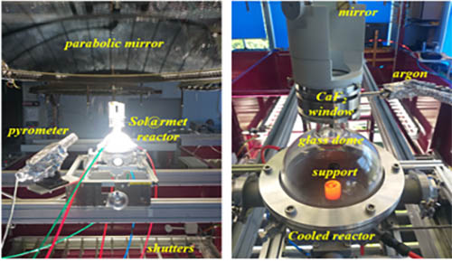 The carbothermal reduction of magnesia was performed in the Sol@rmet reactor using a 1.5 kW solar furnace that concentrate the solar power up to 11000 suns. The reaction temperature was controlled by opening the shutter placed between the heliostat and the parabolic mirror as shown in Figure 1.
