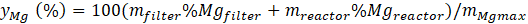 The performance of the magnesia reduction was determined by computing the magnesium metallic yield (yMg ) according to Eq. 1, where is the maximum quantity of Mg that can be produced taking into account the initial molar quantity of MgO. %Mgfilter and %Mgreactor are the percentages of Mg in the collected powders on the filter and the reactor walls, respectively. The accuracy of the Mg quantification method was estimated to be lower than 10% for a Mg percentage higher than 90% [14]. Thus, a relative error of about ± 5% is considered for the results of the Mg yield.