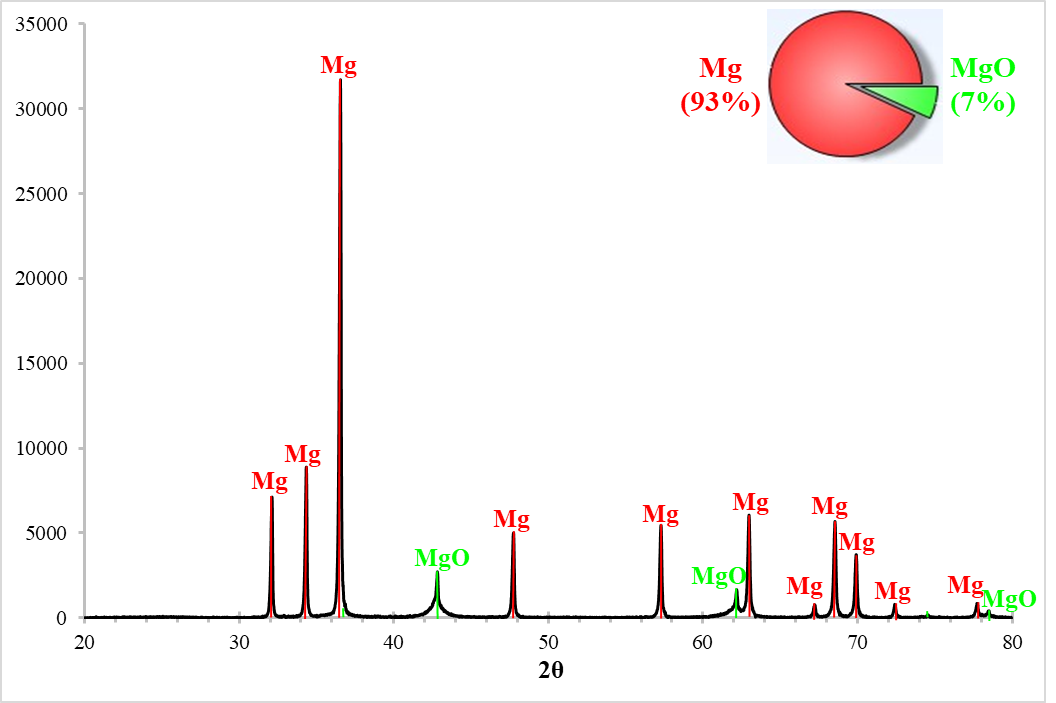 The temperature profile during the reduction of the C/MgO + 10% PVA pellet (test B1) is illustrated as a function of the reaction time and shutter opening in Figure 5. The collected powders (on the filter or in the reactor) are analysed by XRD and quantified to determine their purities. The XRD pattern of the powders collected on the filter after the reduction of the C/MgO + 10% PVA pellet is presented in Figure 6, where only Mg and MgO peaks are detected and quantified.