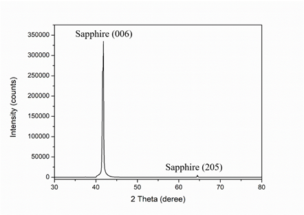 The XRD spectrum of sapphire wafer is measured in the 2θ= 30-80 degree range by using a X-ray diffraction meter with a Cu Kα radiation source (λ= 0.154 nm). As shown in Figure 1, it is clearly observed that the wafer shows a strong sapphire (001) peak at about 41.6o with a small peak (205) at about 64.5o. The existence of the strong (0001) diffraction peak confirms a high crystallinity of the sapphire substrate. Reported by numerous research, epitaxy growth on c-cut sapphire has known by far the most optimal option due to its better crystallinity [31], and strong photoluminescence emission [32,33].