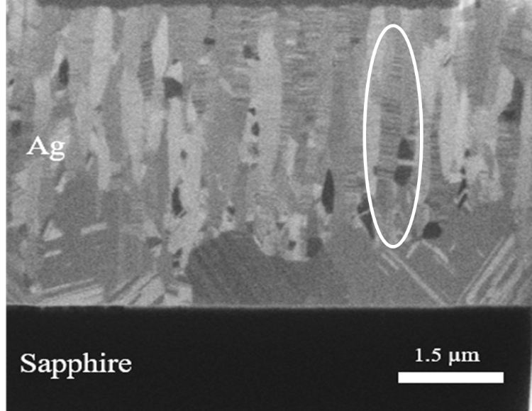 The cross-sectional micrograph of Ag film sputtered directly on the sapphire substrate without any adhesive layer exhibit small amount of columnar structure as circled in Figure 2.