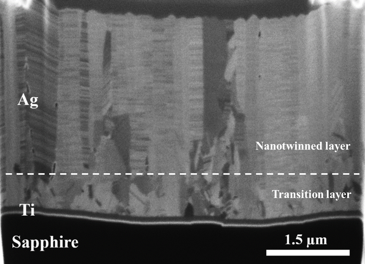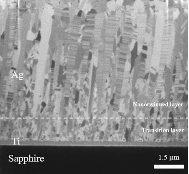 The thickness of the transition layer was determined by measuring the distance from the boundary of Ag/Ti or Ag/Sapphire to the top of the deposited Ag nanotwinned thin film at 10 equally-spaced points on the FIB micrograph and calculating the average thickness.