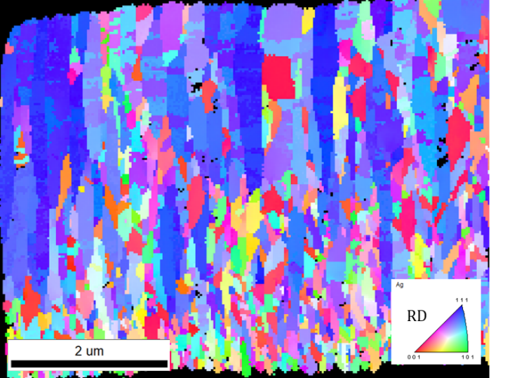 To mitigate the lattice mismatch between Ag and sapphire wafer, a Ti adhesive layer is usually added between the sapphire substrate and Ag film for better bondability. Figure 3 shows the cross-sectional FIB image micrograph of nanotwinned Ag films sputtered on sapphire substrate with a layer of Ti adhesive layer. As known to all, Ti shares the property of adhering well onto substrate materials. In addition, thin layer of Ti (probably 0.1 μm) does not typically alter the property of the device that is fabricated. The sites in the thin adhesion layer serve to promote nucleation of the Ag thin film which might not properly adhere on the substrate, resulting the film to flake off from the substrate. Apparently, higher density of Ag nanotwins is observed within columnar grain structure with finer equiaxial grains in a thinner transition layer (1.166±0.19 µm), indicated by the dashed line. The transition layer is usually being treated as defects as these fine equiaxed grains are prone to abnormal grain growth during subsequent wafer bonding process. Therefore, a thinner transition layer is often more desirable for better thermal stability of the overall. The high-resolution EBSD orientation map for the cross-sectional Ag film is shown in Figure 4. Grains marked blue are oriented with the (111) plane parallel to the substrate surface, consisted of 34.6% of the overall microstructure. The fine equiaxial grains in different colors are of random orientations. The orientation of fine equiaxial grains is mostly random. Again, the XRD spectrum in Figure 5 founds a strong intensity of Ag (111) peak without any other impurities peaks and is consistent to the EBSD analysis.