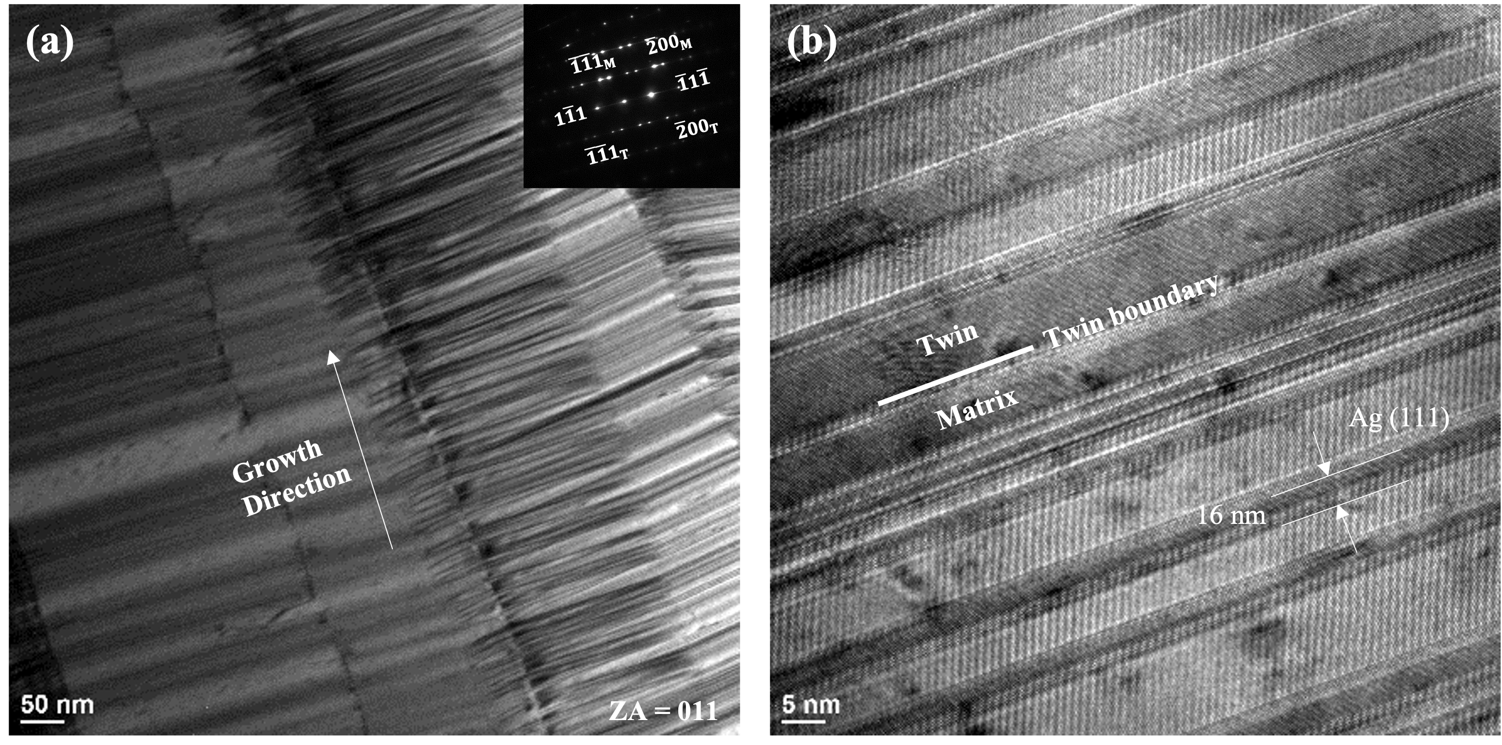 In addition to FIB imaging, the nanotwinned structure of the sputtered Ag nanotwin structure is further investigated by transmission electron microscopy (TEM) film. Figure 6 (a) shows the cross-sectional bright-field TEM images of the Ag film sputtered on Ti pre-coated sapphire substrate, taken along the zone axis of [011]. High density of stacking nanotwins are observed along the columnar grains, whereby the twin interfaces are parallel to the substrate surface. In the SAD pattern, the matrix and twin diffraction spots showed spot splitting across the {111} twin interfaces, which are identified to be stacking faults. Statistical measurement of the twin spacing indicated an average of 16 nm, as evident from the HR-TEM image in Figure 6 (b). The fast Fourier transform of the film has confirmed a typical (111)-oriented twin structure, which is consistent with the XRD analysis in Figure 5.