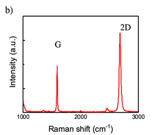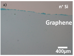 To grow the graphene layer on Si substrate, chemical vapor deposition method was employed after electrochemical polishing of a copper foil. The copper foil was then placed into the quartz tube and load into the chamber. The chamber pressure was evacuated to 10-3 torr, and heated to 1000˚C for 40 minutes under the hydrogen flow with the flow rate of 10 sccm. Next, the copper foil was annealed at 1000˚C under hydrogen atmosphere (10 sccm) for an hour to reduce the oxidized copper and stimulate the grain growth, which can improve the quality of graphene. After annealing, insert the methane gas with the flow rate of 10 sccm and adjust the hydrogen gas to 100 sccm. At this stage, graphene is grown under the mixture of H2:CH4 =10:1 for an hour. Finally, CVD graphene is cooled down rapidly to the room-temperature under hydrogen atmosphere to avoide oxidize. Then the graphene layer would be transferred using a strong organic polymer, such as EVA, to tightly hold onto the graphene on the surface of a copper foil. Once the EVA has dried, the copper foil is placed in an etching solution (iron chloride, nitric acid) to remove the copper layer beneath the graphene. After etching, the remaining organic polymer and graphene film are cleaned with deionized water and placed onto the desired substrate. Using compressed air, the water underneath the graphene is blown away, allowing for van der Waals bonding between the graphene and the silicon substrate. Finally, the entire substrate is immersed in o-Xylene at 800C to remove the surface organic polymer layer, resulting in the successful transfer of graphene onto the desired substrate.