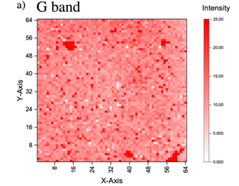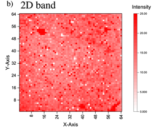 Thus, we transfer a graphene layer on the n+Si substrate. Figure 4a shows the optical microscopy image of transferred graphene layer on n+ Si substrate, and the Raman spectra of the graphene layer is shown in Figure 4b. It can be seen that the peak of G and 2D appeared obviously in the spectra, and the spectra shows that the sharp 2D peak, which means it has less defect and the graphene is monolayer. In addition, the ratio of intensity is about 1:2, indicating the graphene layer truly existed. Figure 5 indicates Raman mapping of graphene after sputtering of both G band and 2D band as shown in Figure 5 indicates that the graphene layer was maintained on the n+Si after sputtering and distributed quite uniform on the substrate.