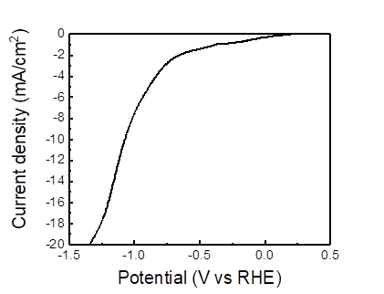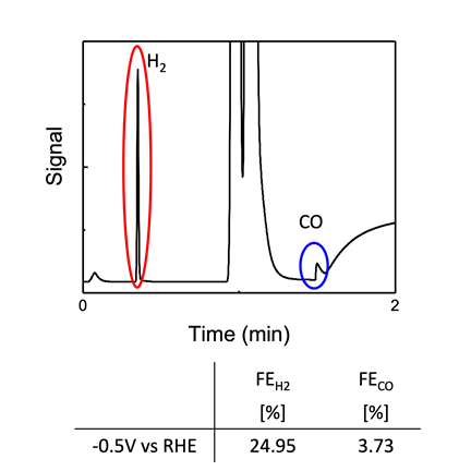 The catalysis of nanotwinned silver film in CO2RR is shown in Figure 8, and the onset potential@10mA/cm2 is -1.0V. Furthermore, Figure 9 reveals the gas chromatography curve of CO2RR products from nanotwinned silver film. It can be seen that there are two peaks of hydrogen and carbon monoxide, respectively. It has been calculated by calibration curve, the Faraday efficiency of hydrogen and carbon monoxide are 24.95% and 3.73%.