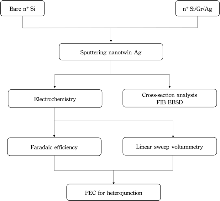 To evaluate the photoelectrochemical efficiency for the n+Si/graphene/ nanotwinned Ag photoelectrode, electrochemical Co2RR measurements were conducted, including Faraday efficiency and linear sweep voltammetry, followed by application in photoelectrochemical (PEC) and measurement of the catalytic effect. Graphene provides accelerated carrier transport, which can enhance the performance and stability of the device in electrolyte [9]. Thus, we compare the samples with and without graphene layer in this study.