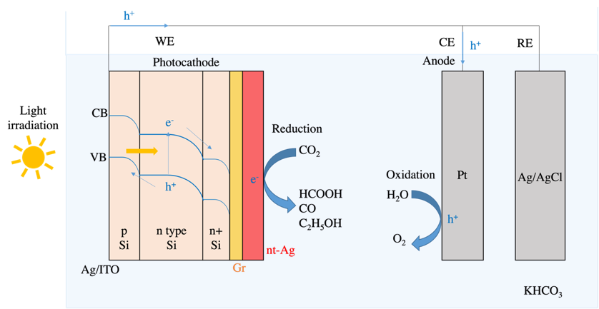 The schematic diagram of the PEC device is shown in Figure 2, consisting of three electrodes, including a photocathode composed of p-type Si, n-type Si, n+ Si, back electrode, graphene, and nanocrystalline silver thin film, forming a heterojunction. A three-electrode system allows for better control and measurement of current and potential, including a semiconductor photoelectrode (p-type or n-type), a metal-to-metal contact, and a reference electrode. The photoelectrode typically contains semiconductor materials, catalysts, and conductive materials. When the photoelectrode is irradiated by light and the energy of the light is greater than the band gap of the semiconductor material, a photoelectric effect occurs, and bound electrons are excited from the valence band to the conduction band, generating electron-hole pairs that undergo reduction or oxidation reactions on the surface of the material. The catalyst reduces the energy barrier for the reaction, and the conductive material is responsible for transmitting electrons and maintaining the electrochemical system's circuit. For an n-type semiconductor photoelectrode, holes are brought to the surface to undergo oxidation reactions, while electrons are transmitted to the counter electrode via an external circuit, where reduction reactions occur. The auxiliary electrode only serves to balance the charge and is usually made of platinum, which has high stability and conductivity to complete the electron circuit.