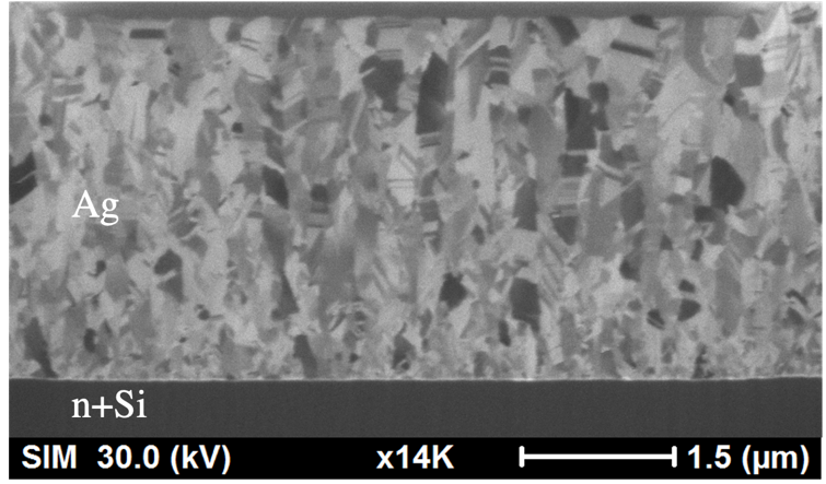 Figure 6 reveals the FIB images of Ag films that were deposited onto n+Si substrates with transferred graphene. The Ag films had also the thicknesses of 4μm. The micrographs reveal that Ag columnar grains grew normally to the Si substrate, and nanotwins piled up on one another. It can also be observed that the twin density in this Ag thin film sputtered on graphene deposited Si substrate is higher than that without graphene layer shown in Fig. 3. In addition, the average transition layer is about 1.4 μm, much finer than that in Fig.3.