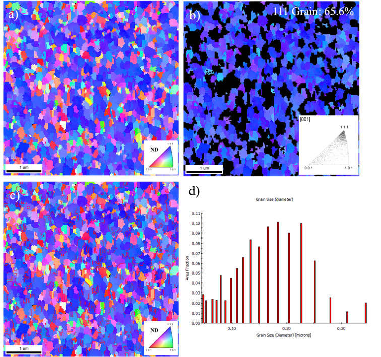 In order to clarify the grain orientations of the Ag thin films, EBSD analysis was showed in figure 7. The EBSD orientation map revealed that the silver films were highly oriented with high density of Ag (111) grains. The ratio of (111)-oriented grains in silver films were calculated to be over 65%, as shown in Figure 7b. In addition, the twin boundaries with Σ3 coincidence site lattice are highlighted with red lines in Figure 7c, with 21.2% of Σ3 boundaries to the total grain boundaries. Furthermore, the grain size in nanotwinned silver film was summarized in the bar chart, indicating that the silver grain sizes were in the range of several hundred nanometers.