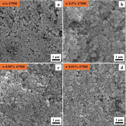 Figure. 1 shows SEM images of LMFP electrodes prepared without dispersant (Figure. 1a) and varying concentrations of Afton dispersant, including 0.5 wt% (Figure 1b), 0.05 wt% (Figure 1c) and 0.01 wt% (Figure 1d). All electrode surfaces display nanoscale particles, which are characteristic of olivine-type phosphate cathode materials. The addition of Afton dispersant does not alter the morphology of the LMFP electrodes, indicating that the dispersant is compatible with the LMFP material during the slurry preparation and does not negatively impact the microstructure.