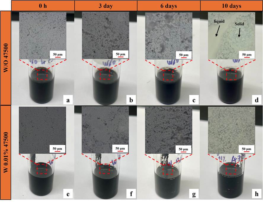 Given that 0.01 wt% dispersant does not compromise battery cycling performance and causes minimal impedance increase, slurry storage tests were conducted to further assess its effectiveness in preventing sedimentation over time. Figure. 4 illustrates the temporal evolution of LMFP slurries without Aton dispersant (Figure 4a-d) and with 0.01 wt% Afton dispersant (Figure 4e-h). Digital microscope images are embedded within each corresponding slurry image to provide a closer look at the dispersion state of the particles. At 0 hours, both slurries, with and without Afton dispersant, initially appeared homogeneous, suggesting that both formulations could be effectively mixed under the same processing conditions. However, the slurry without the Afton dispersant exhibited increasing sedimentation over time. Sedimentation is a common phenomenon in particle suspensions where, in the absence of sufficient steric or electrostatic stabilization, heavier solid particles tend to settle at the bottom due to gravity. Starting from day 6, visible phase separation began to appear in the slurry without the dispersant, as seen in both the glass vial and the corresponding microscopic image, indicating that the solid particles were no longer evenly suspended in the liquid medium. This separation became more pronounced by day 10, where a distinct boundary between the sedimented solid phase and the supernatant liquid was clearly visible, confirming a significant loss of dispersion stability. In contrast, the slurry containing 0.01 wt% Afton dispersant maintained a uniform and homogeneous appearance throughout the same period. The consistent appearance under both macroscopic and microscopic observation highlights the effectiveness of the test component as a dispersant. The surfactant used has a composition with a long polymeric tail and an ionic head group. These attributes likely lead to steric hindrance and electrostatic repulsion respectively compared to the control that prevented particle agglomeration and sedimentation, thereby preserving the homogeneity of the slurry over time.